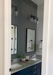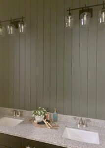Creating a vertical shiplap bathroom accent wall in a jack-and-jill bathroom. Taking the bathroom from rustic and dated to modern and elegant with a quick, easy, and fun home project. Shiplap is a type of