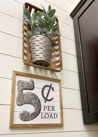 Adding the wall decor finished off the space creating the look I wanted. Soft greens and a basket for texture and warmth then a cute metal sign that is perfect for a laundry room.