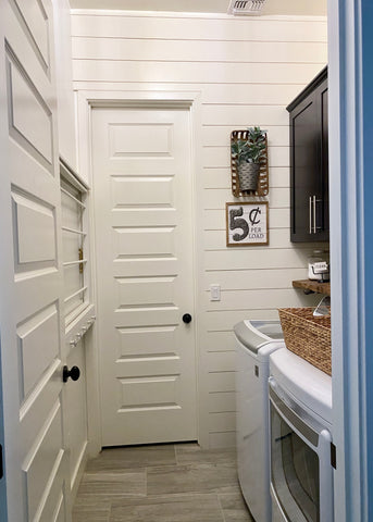 To begin we added shiplap to two walls, behind the washer and dryer and up the wall that you see when you walk in.