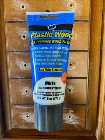 The plastic wood filler dries hard and can be sanded.  It also comes in many colors.  We had white so that is what I used.  Not a problem because we were going to paint it.  Grab your wood filler Here.