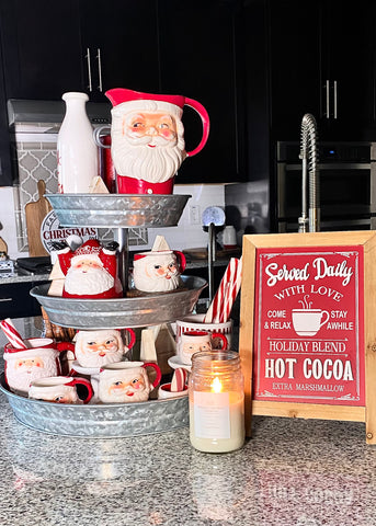 My first suggestion would be to have a theme in mind. Are you decorating for a holiday or are you using everyday decor? If it’s a holiday like Christmas be sure to have a theme in mind. You don’t want to fill it full of everything Christmas. My favorite Christmas tray is Hot Chocolate. My reason for that is I have some Santa mugs that my grandmother painted 50 years ago that I love to display and use during the holiday. I start with those then get creative adding new decor pieces and candy that go with my theme.