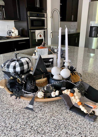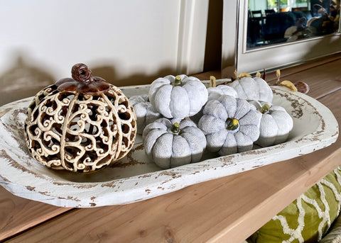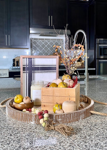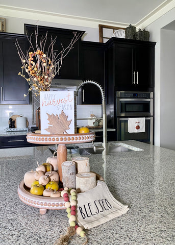 I have found having a beautifully styled tray whether it is a tiered tray, large flat tray or a dough bowl is a great way to have seasonal decor and not have a large amount of decor filling up my home.